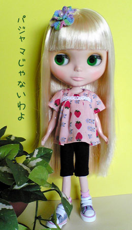 イチゴ柄ブラウス 2007.06.072026.03.06 なんかパジャマみたいになっちゃったよーな気がする。後ろが全開になっていて着せやすい仕様。黒いハーフパンツは何にでも合うので着回しOK。髪飾りもバッグもレース手編みです。