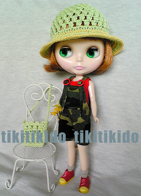 迷彩オーバーオール第2弾 2007.06.282025.09.04 迷彩柄ってバリエーションがいろいろあって、選ぶの迷っちゃう。白っぽい迷彩と、グリーン系と2パターン作りました。ニット帽と手編みのハット、どちらも似合う。靴は百均の髪ゴムを解体したものです。靴の形のヘアアクセ、発想がおかしい(^o^)